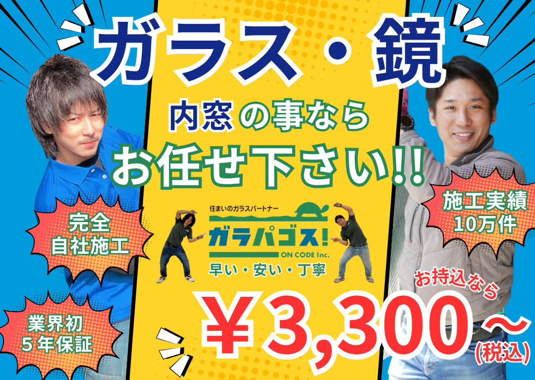 福岡県の窓ガラス修理なら施工実績10万件以上のガラパゴスにお任せ!福岡最安料金で最速30分の即対応!ガラス交換・鏡工事・二重窓(内窓)も完全自社施工!