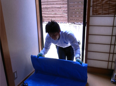 ガラスの交換作業が完成したサッシ窓を慎重に搬入致します。